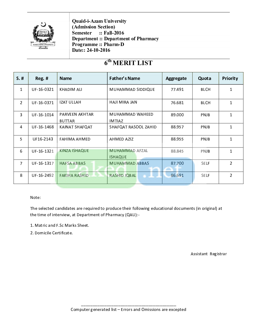 Quaid-i-Azam University - Sixth Merit List Fall 2016 - Pharm-D