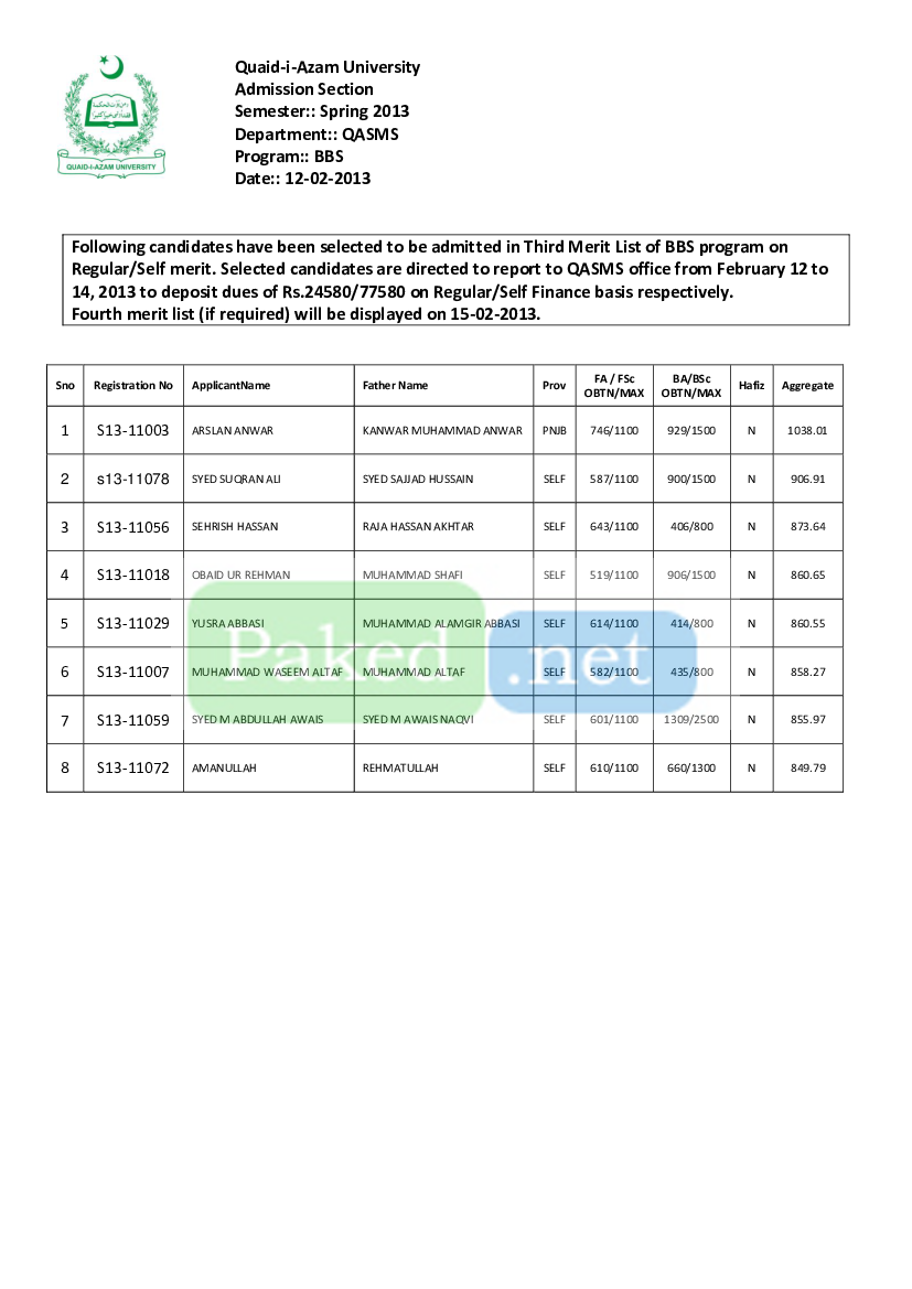 Quaid-i-Azam University - Third Merit List Spring 2013 - BBS